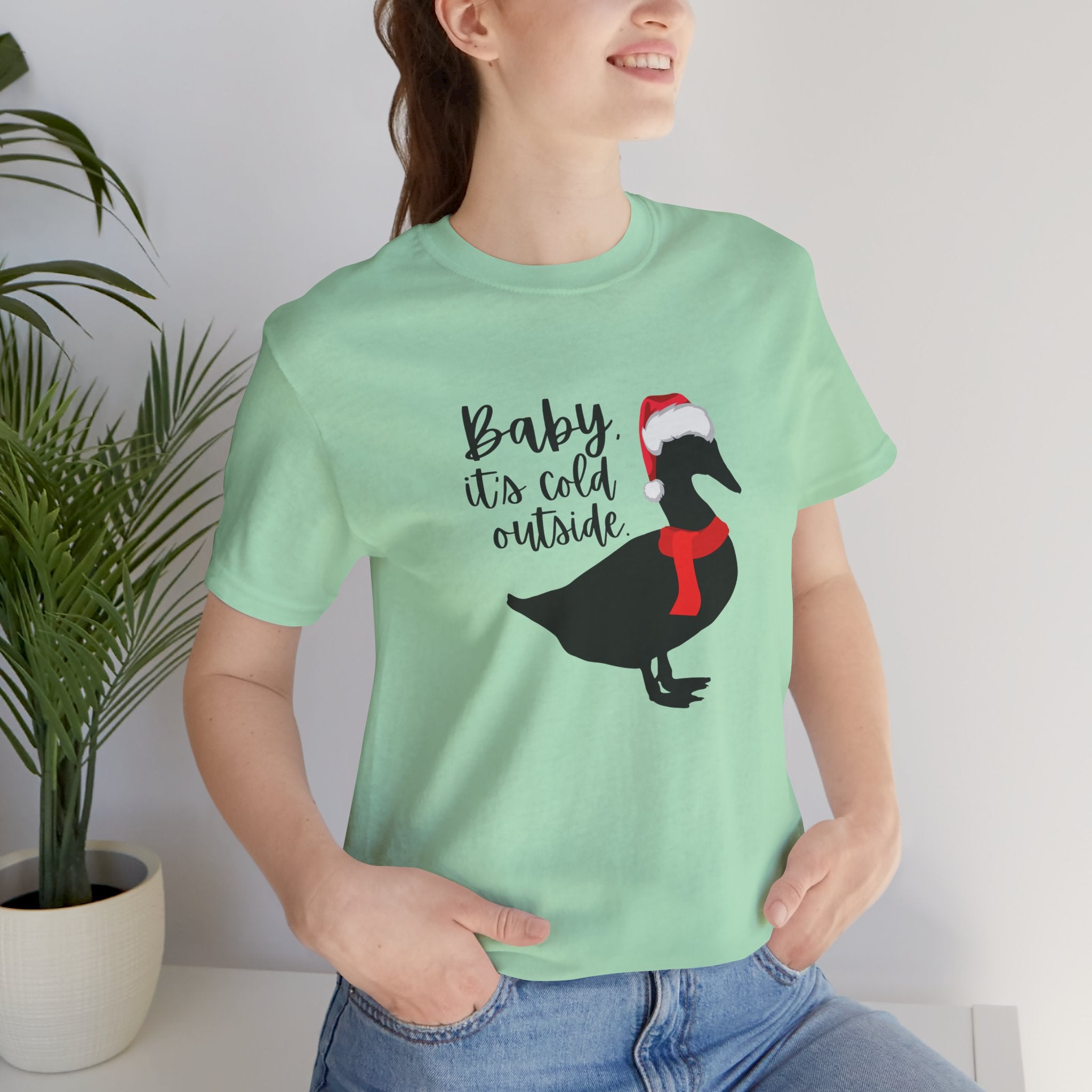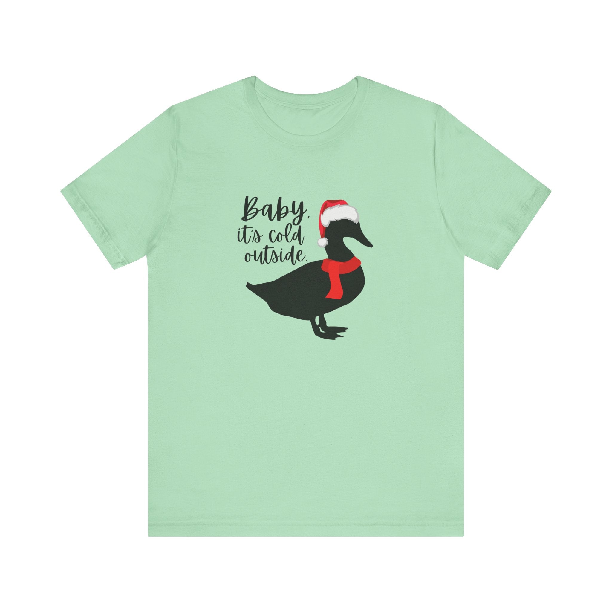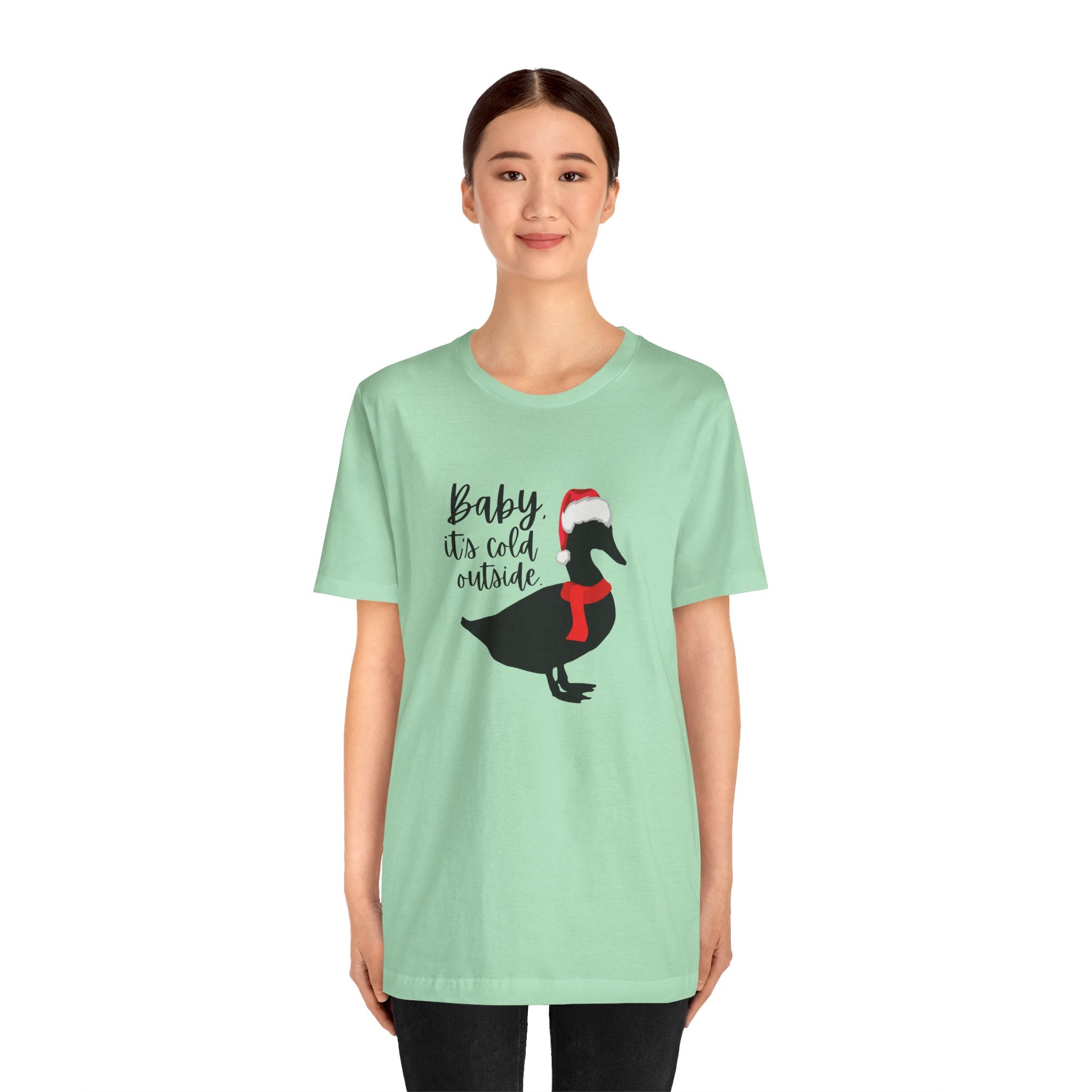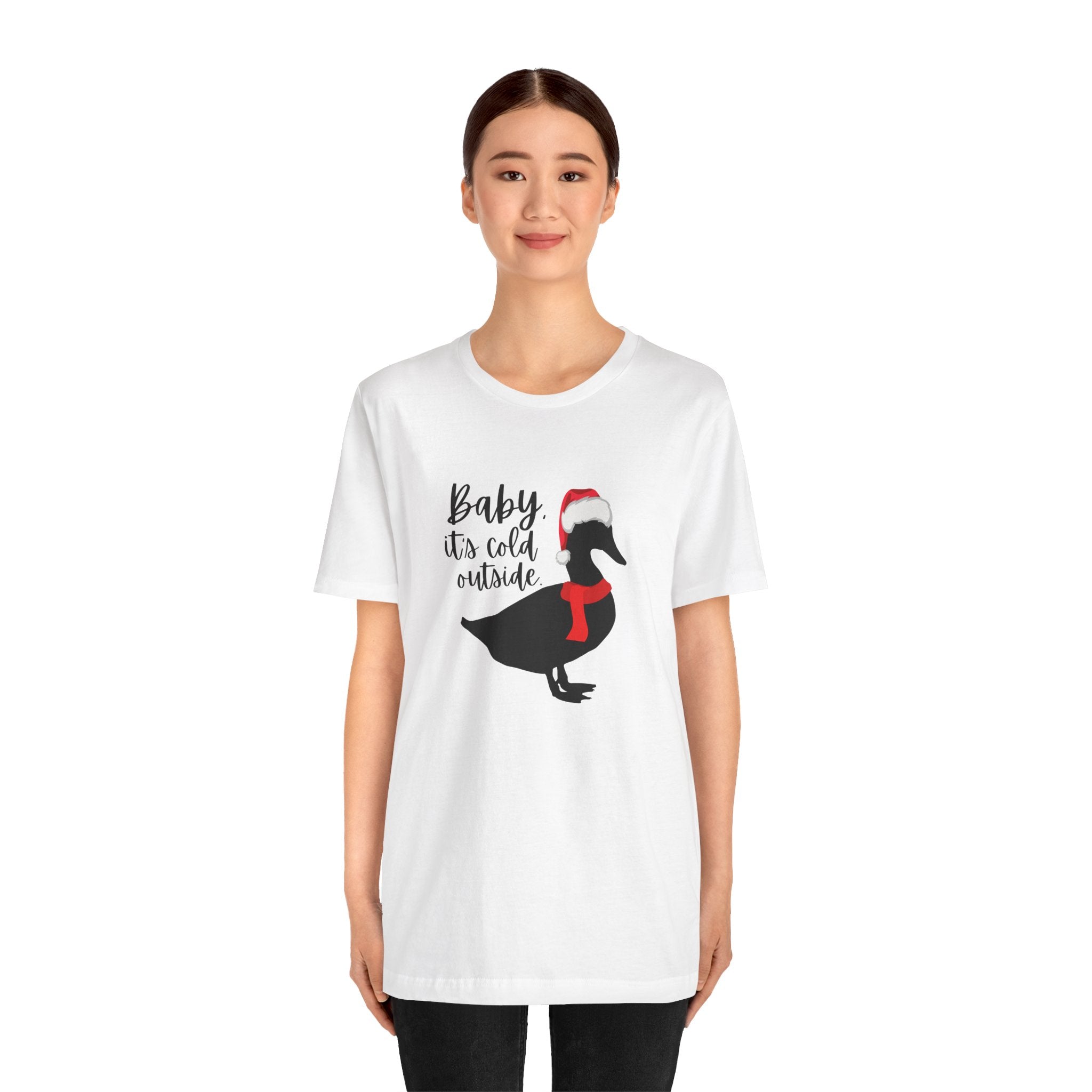 This T-Shirt features a cute design of a duck wearing a Santa hat with a slogan that says 'baby it's cold outside'. Perfect for duck lovers and farm enthusiasts, this tee is ideal for the holiday season or any casual day out.