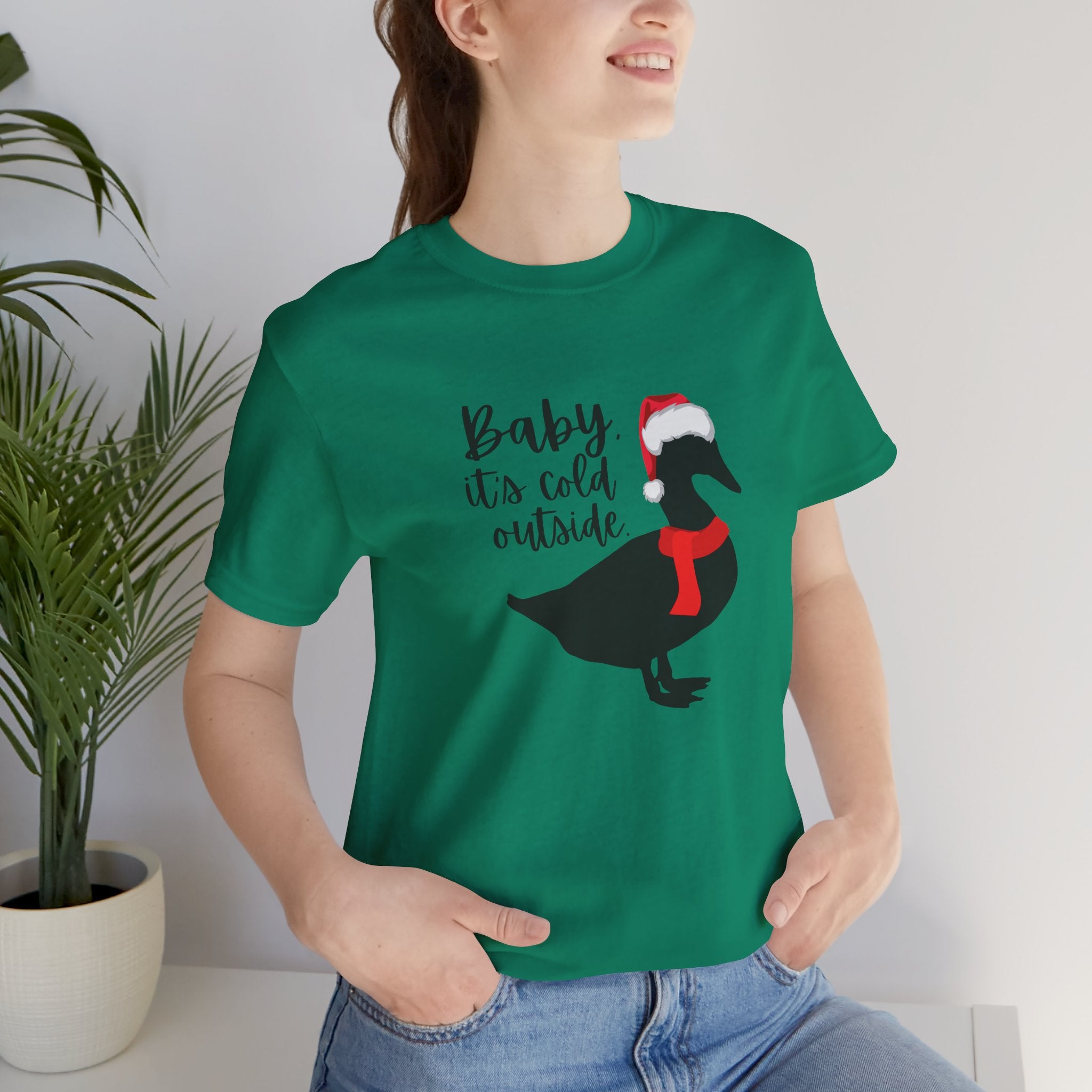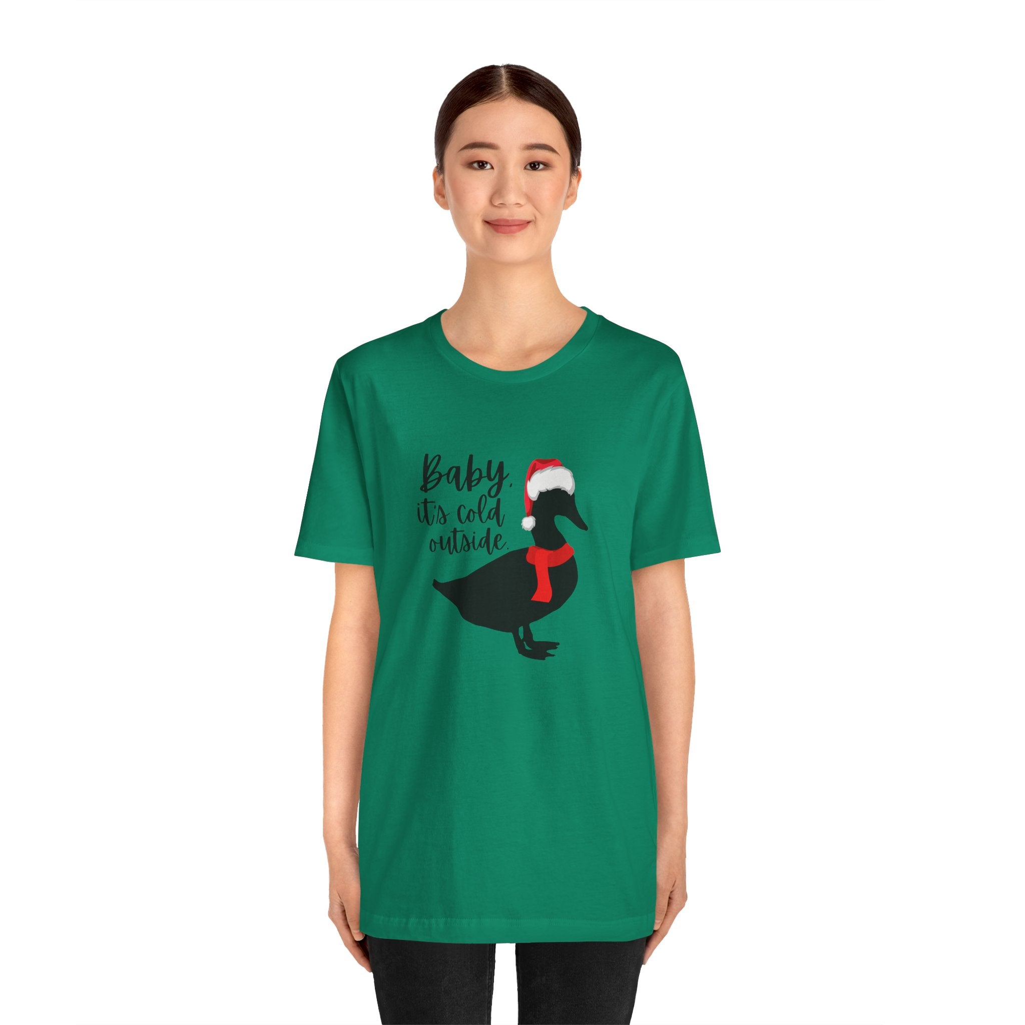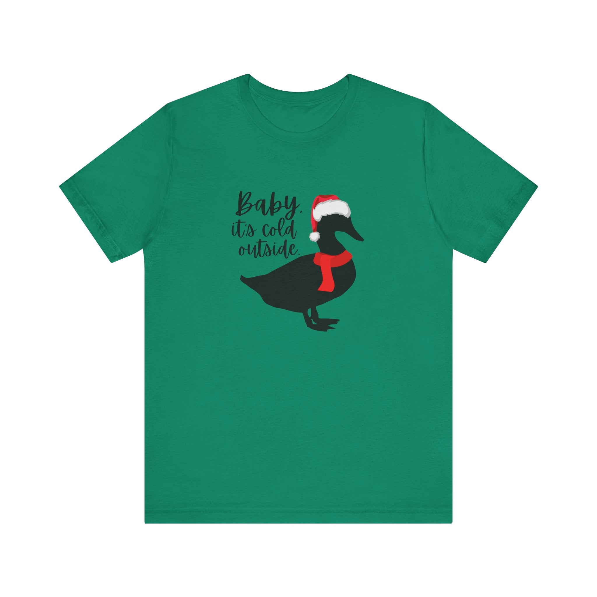 This T-Shirt features a cute design of a duck wearing a Santa hat with a slogan that says 'baby it's cold outside'. Perfect for duck lovers and farm enthusiasts, this tee is ideal for the holiday season or any casual day out.