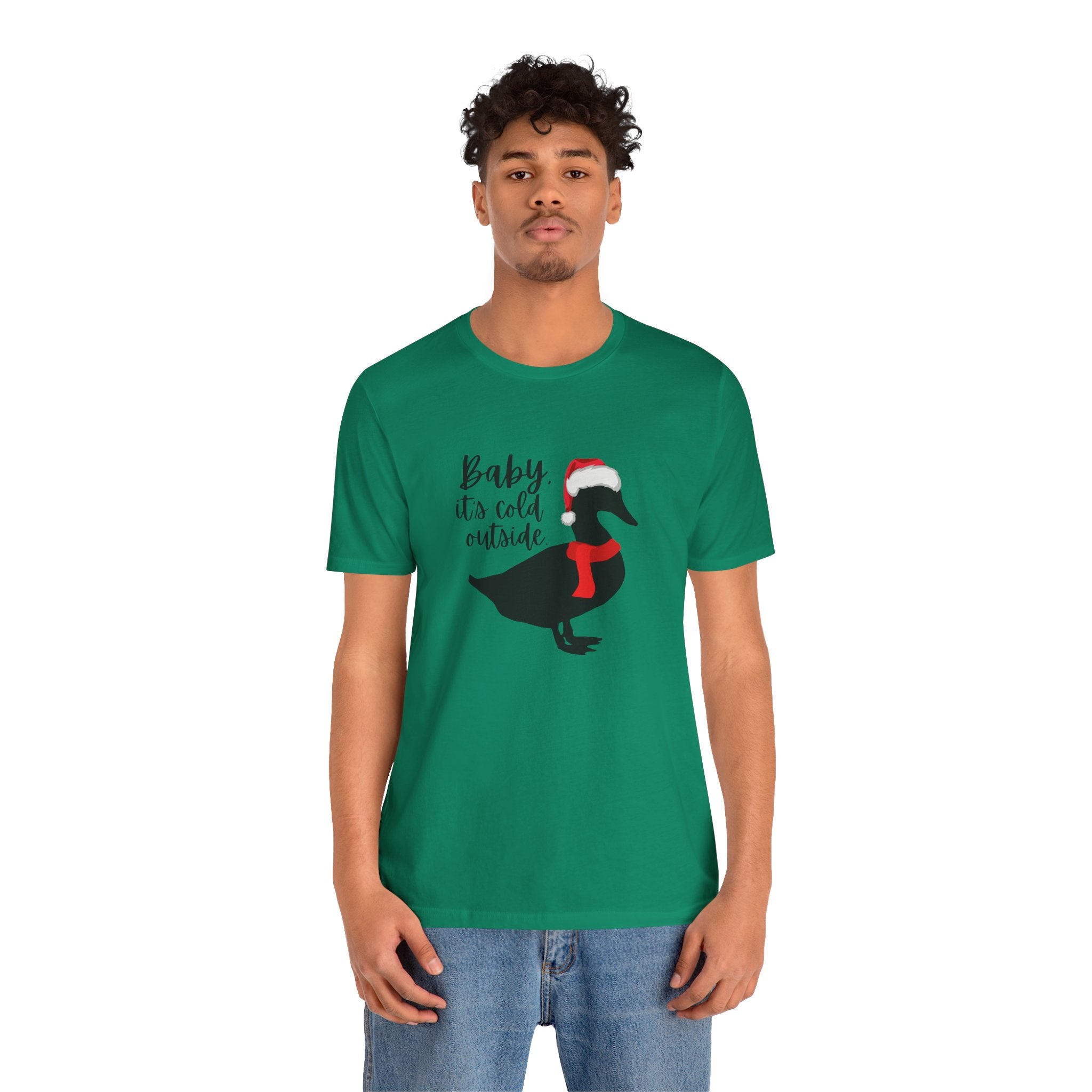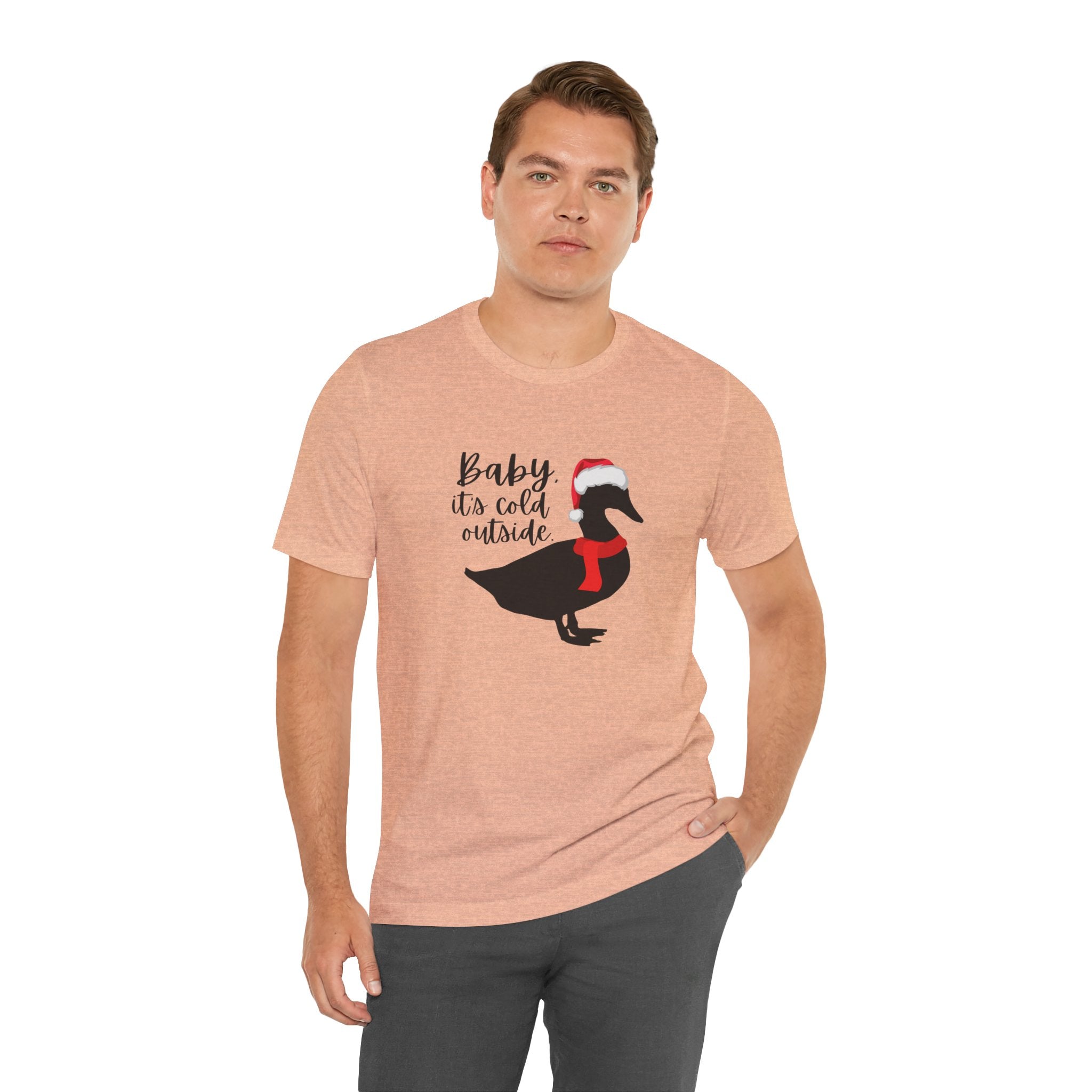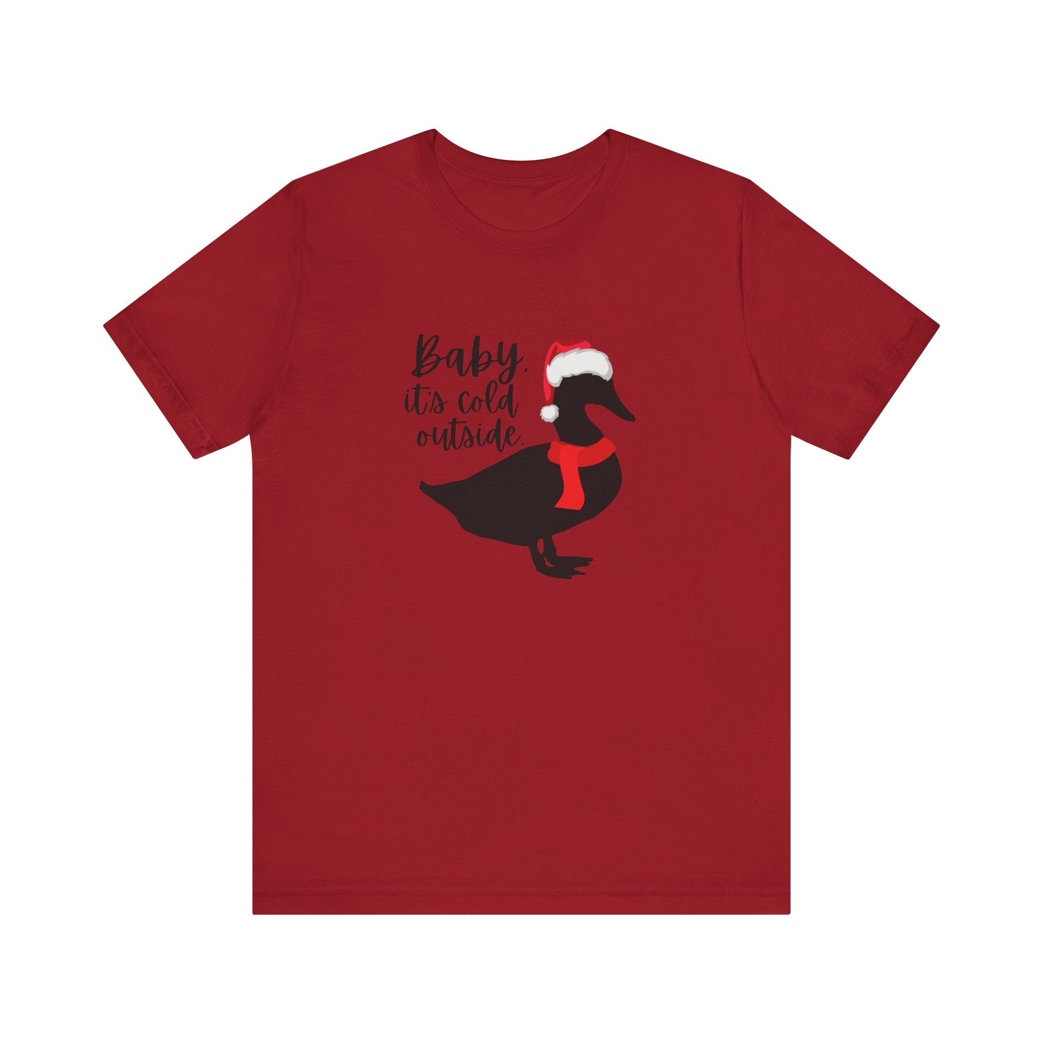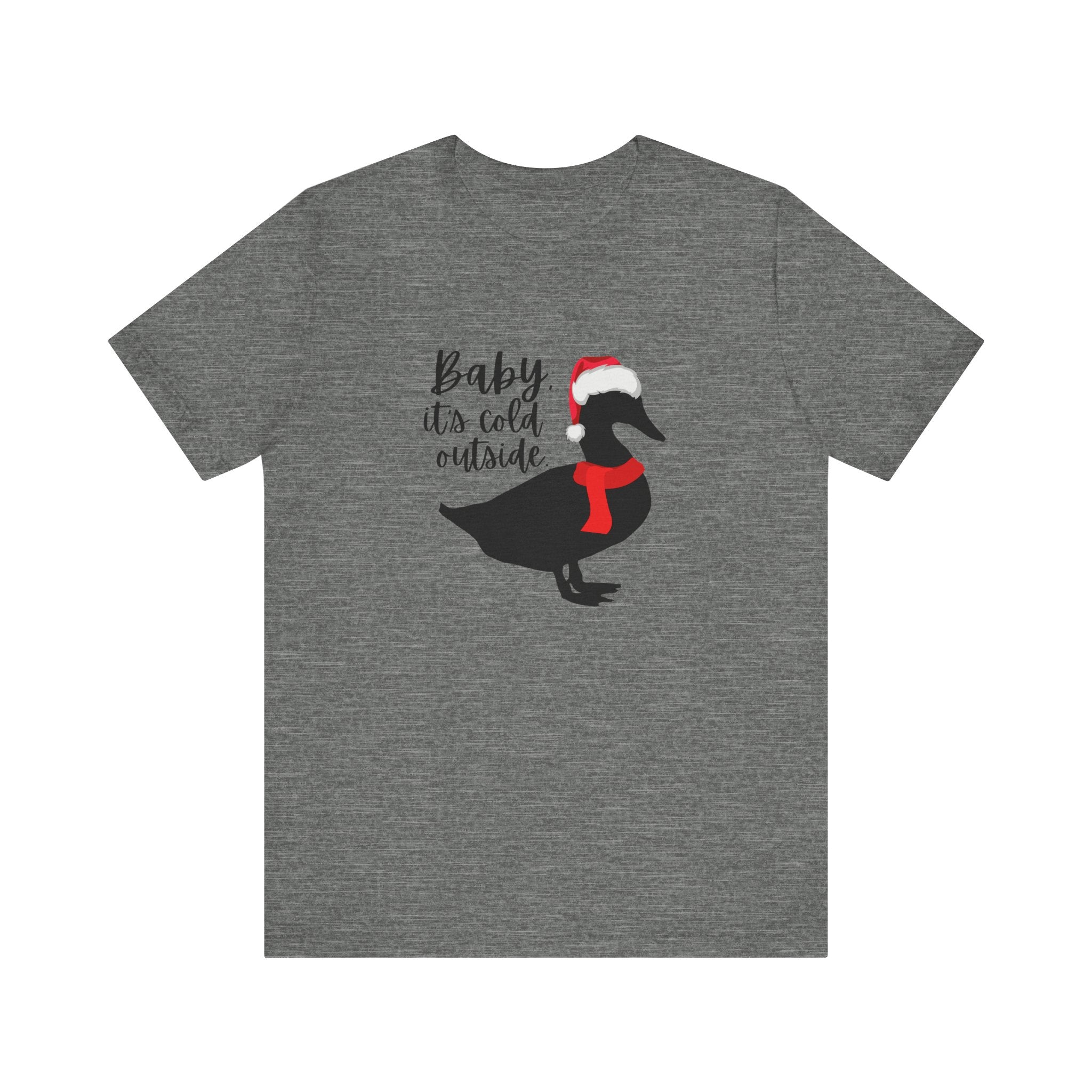 This T-Shirt features a cute design of a duck wearing a Santa hat with a slogan that says 'baby it's cold outside'. Perfect for duck lovers and farm enthusiasts, this tee is ideal for the holiday season or any casual day out.