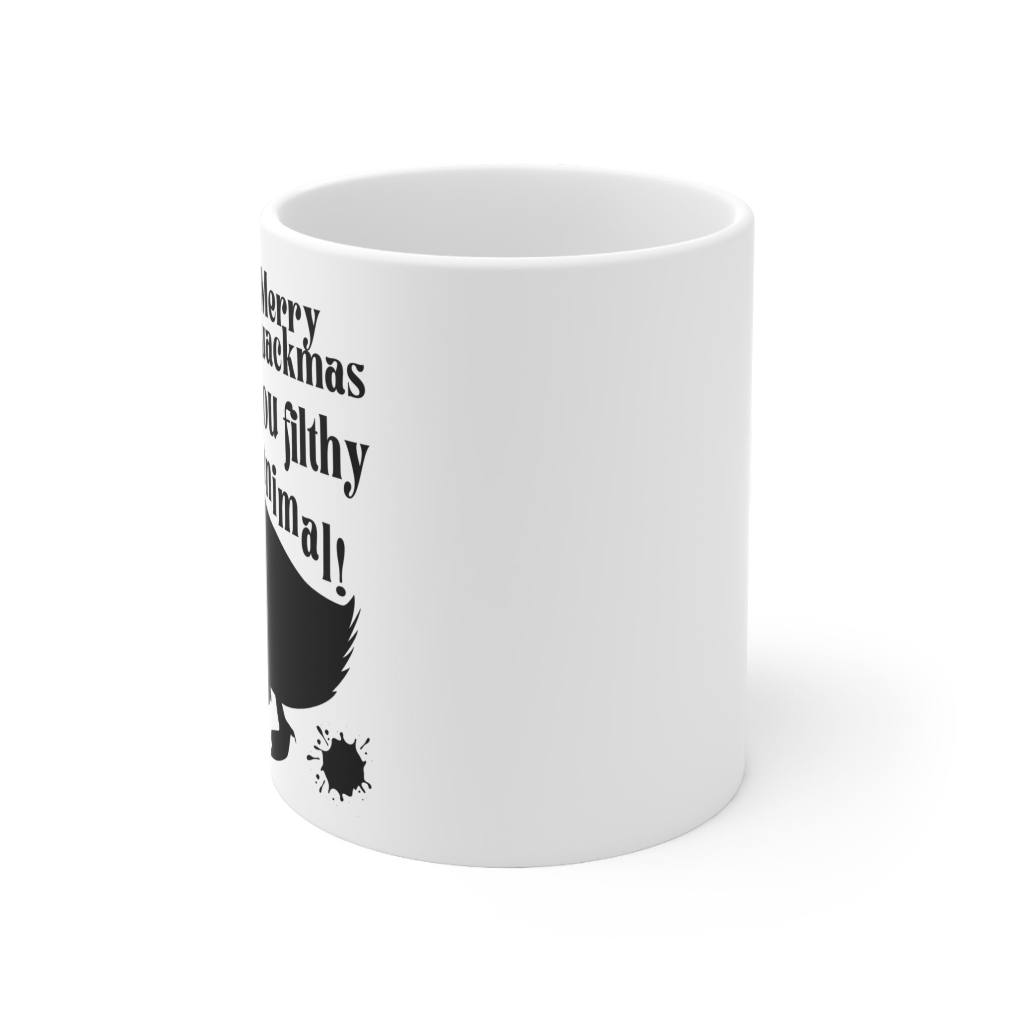 Add a touch of quirky humor to your morning coffee routine with this ceramic mug featuring the phrase 'Merry quackmas you filthy animal' and a duck in a Santa hat pooping. Perfect for those who enjoy fun and lighthearted holiday decor.