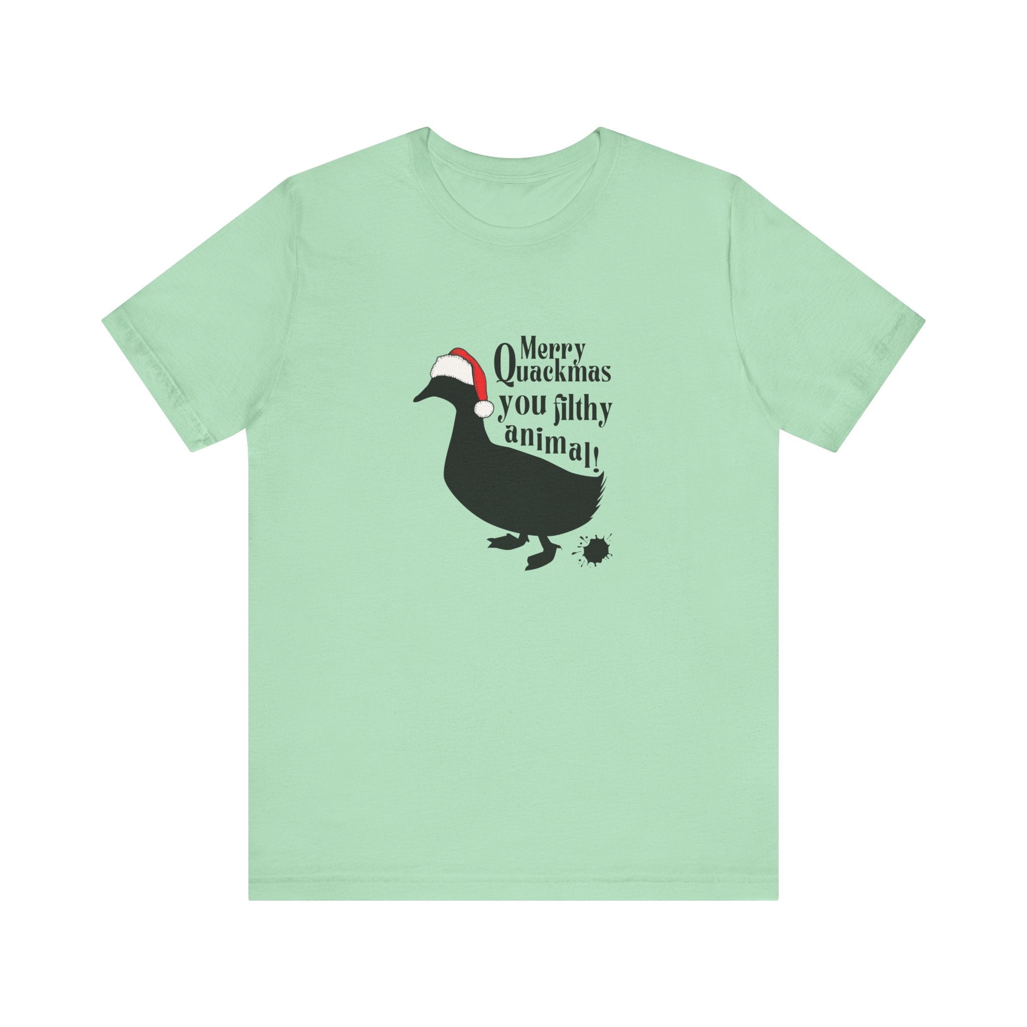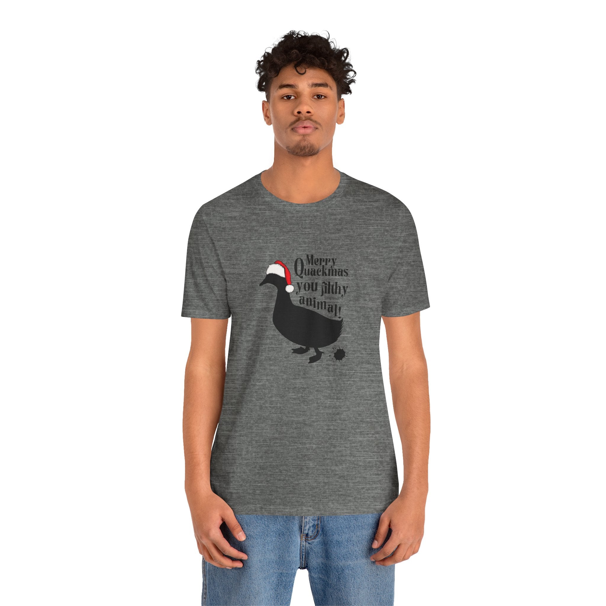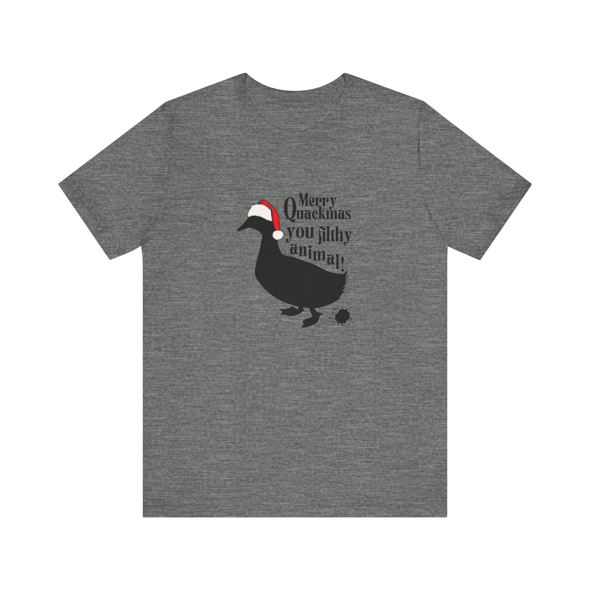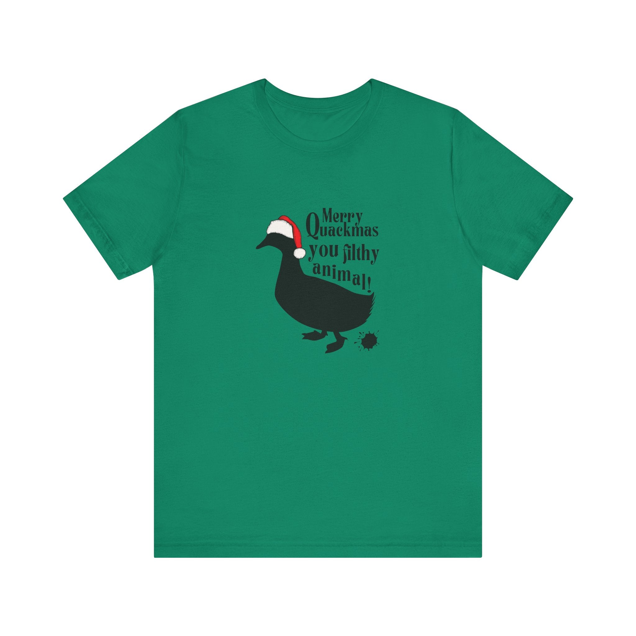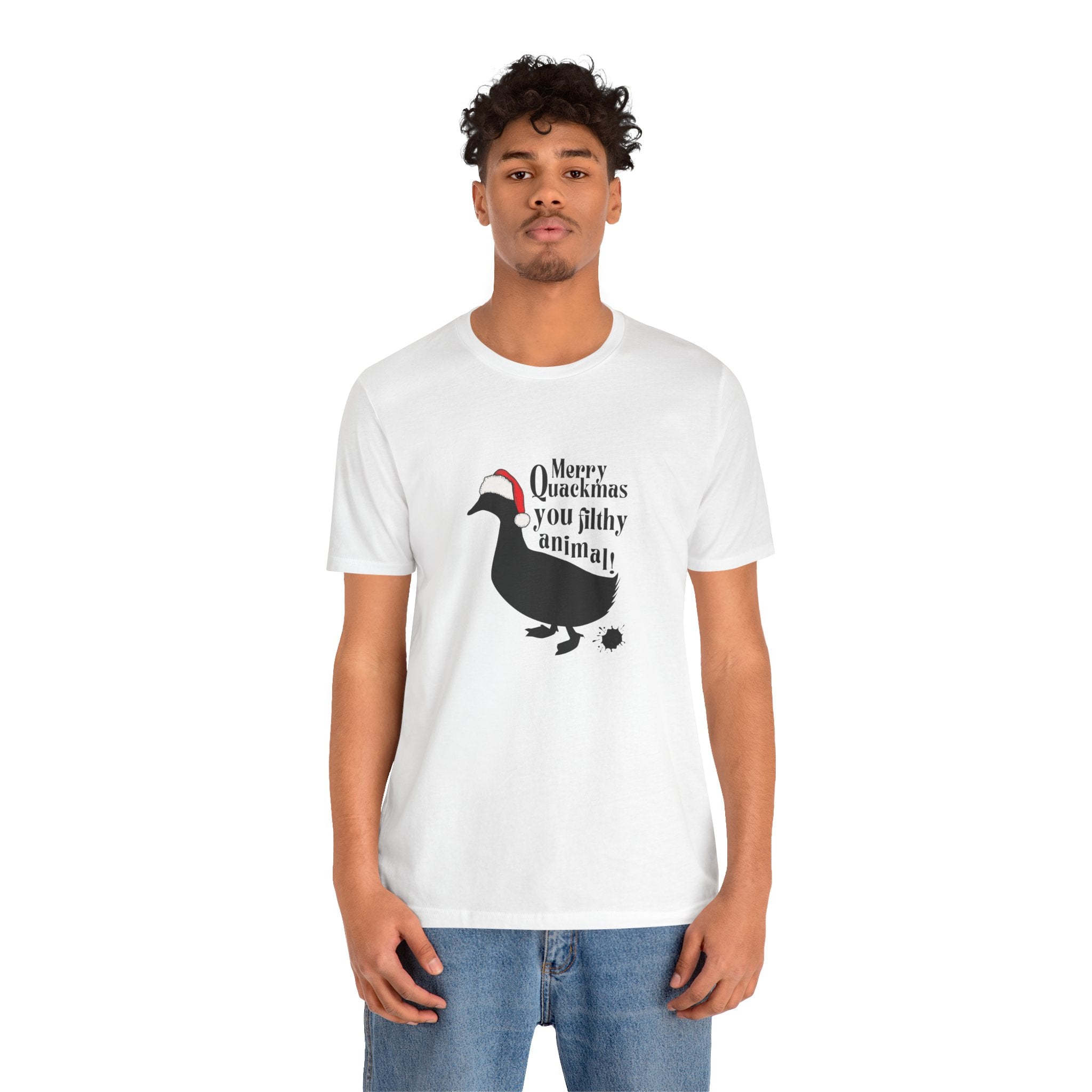 This T-Shirt features a design of a duck in a Santa hat pooping with the text 'Merry quackmas you filthy animal'. It adds a touch of humor and festive spirit to your holiday wardrobe. Perfect for those who enjoy quirky and unique holiday attire. Ideal for Christmas celebrations and holiday parties.