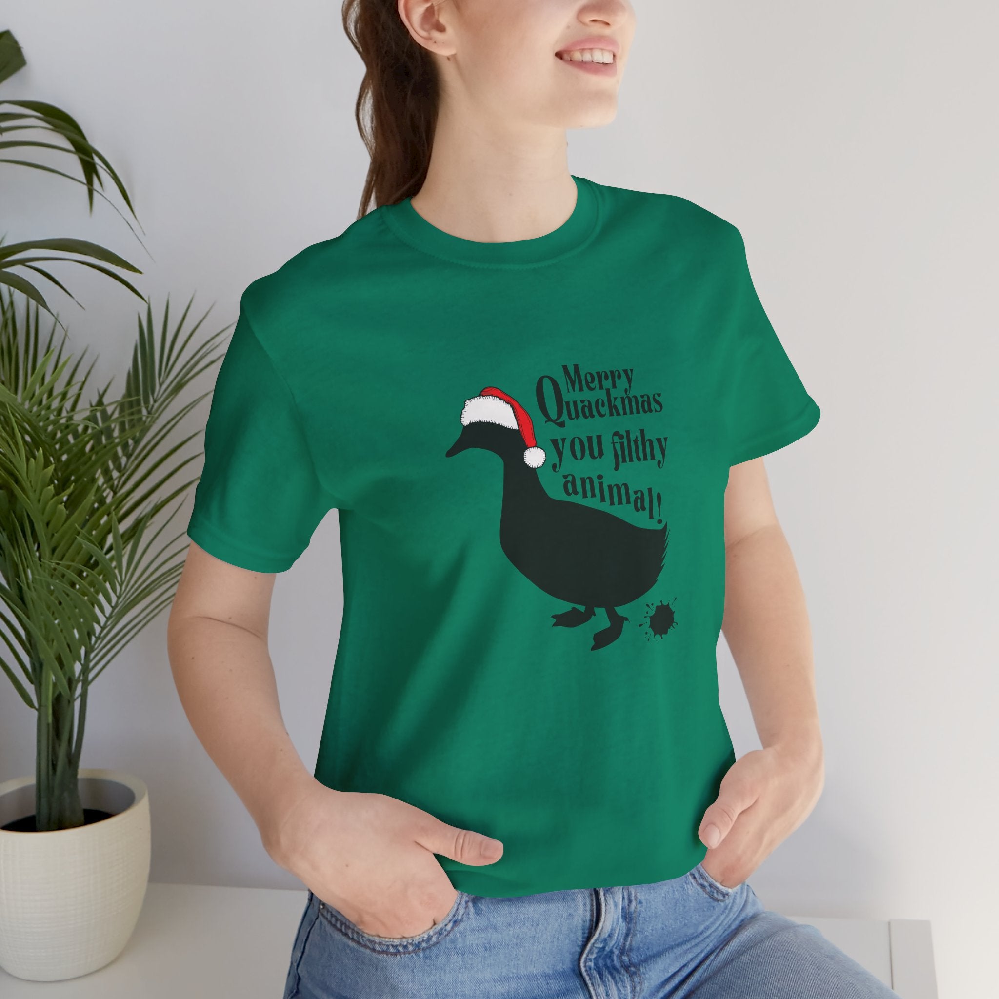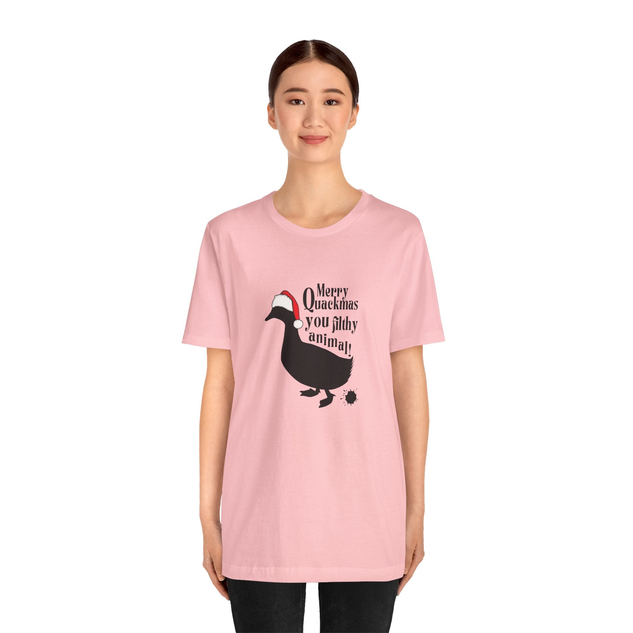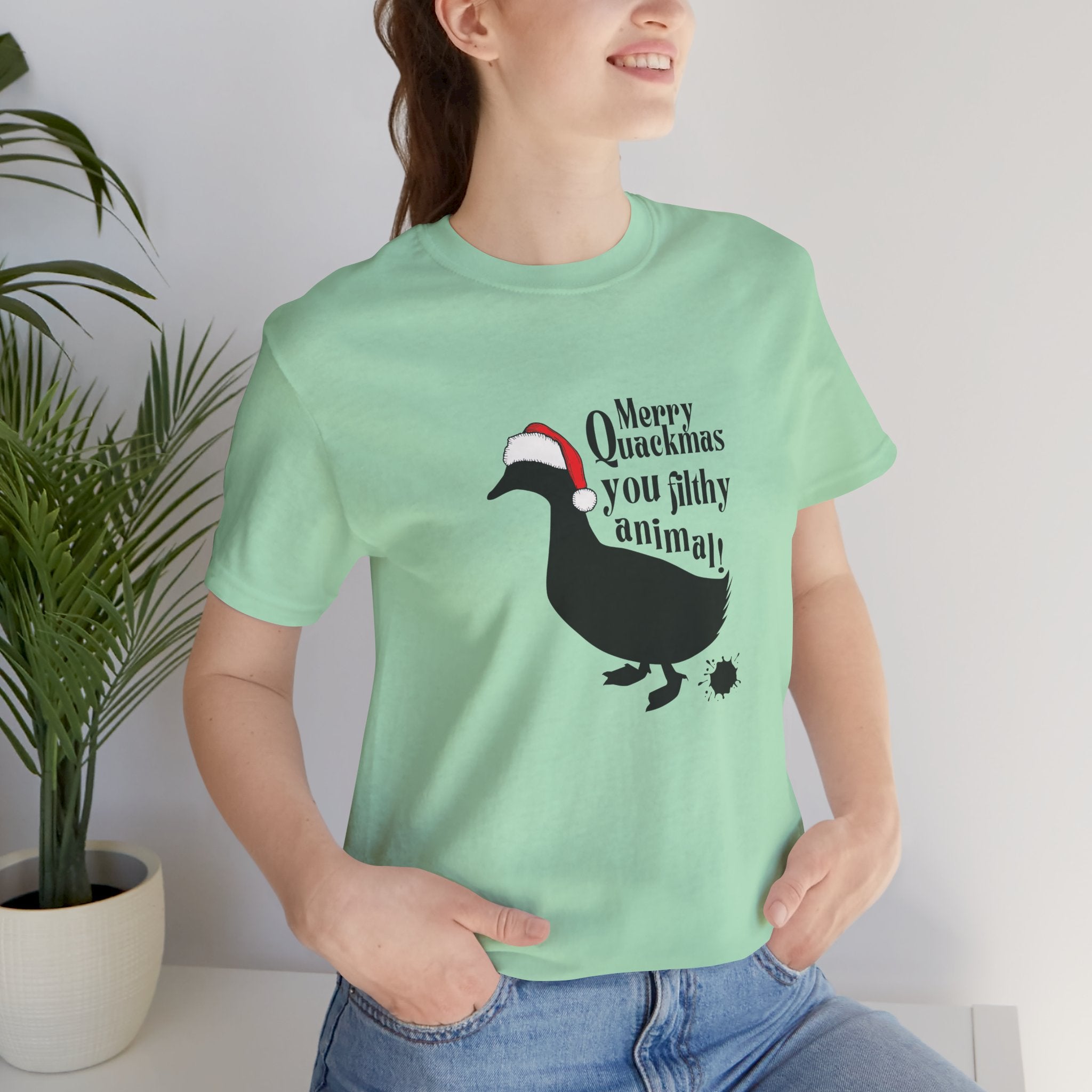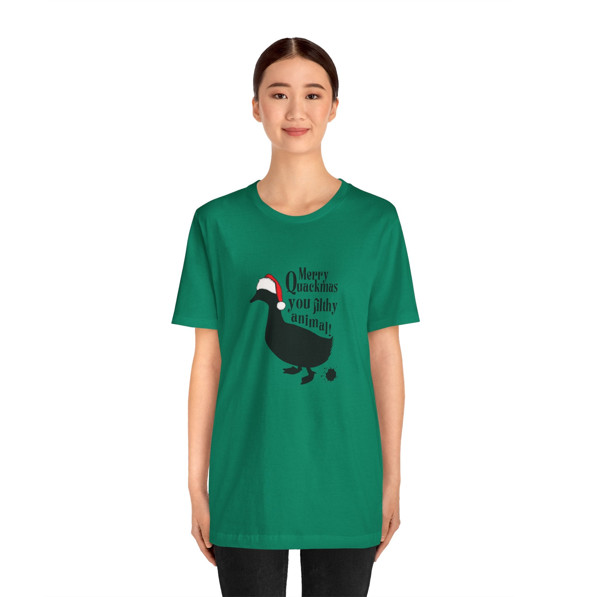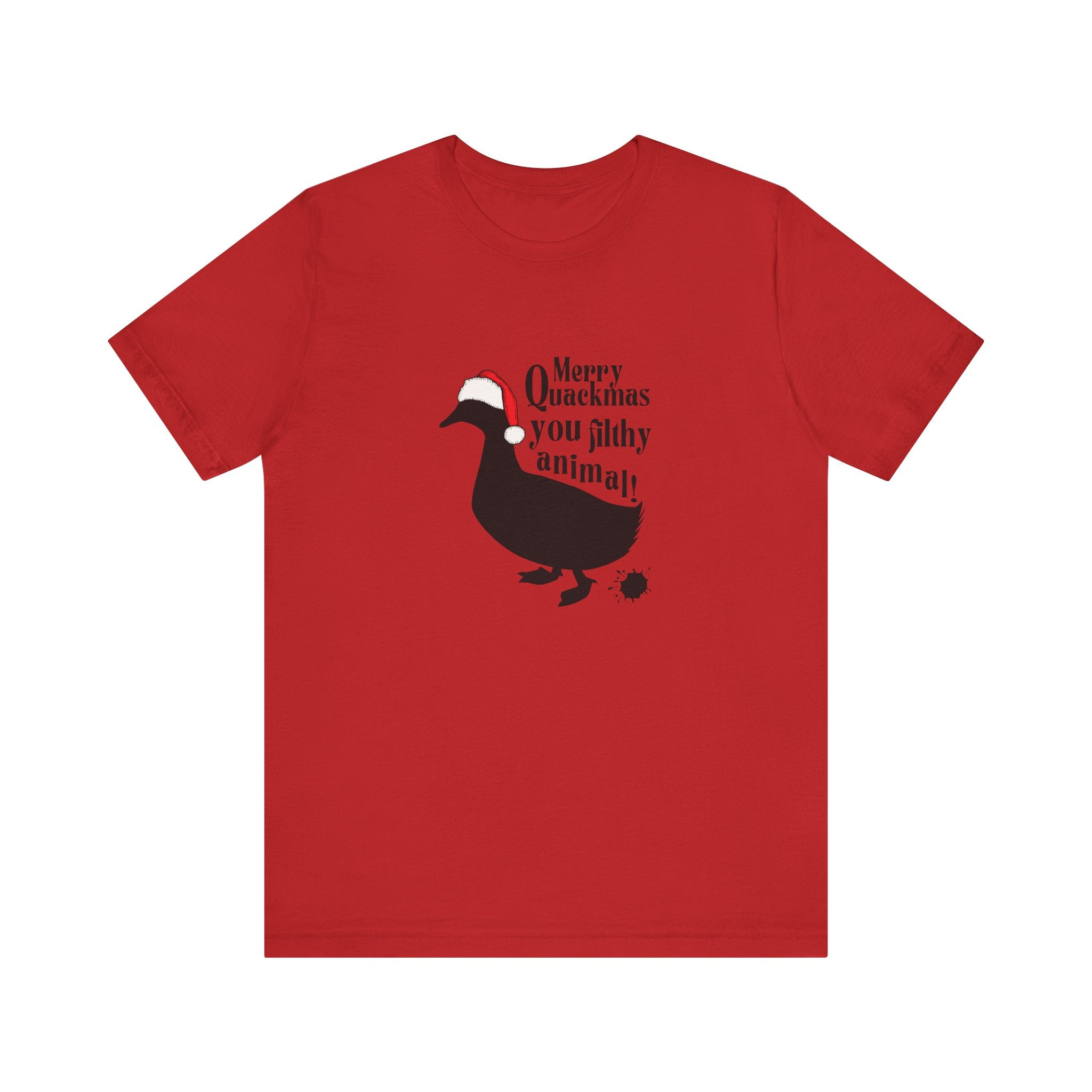 This T-Shirt features a design of a duck in a Santa hat pooping with the text 'Merry quackmas you filthy animal'. It adds a touch of humor and festive spirit to your holiday wardrobe. Perfect for those who enjoy quirky and unique holiday attire. Ideal for Christmas celebrations and holiday parties.